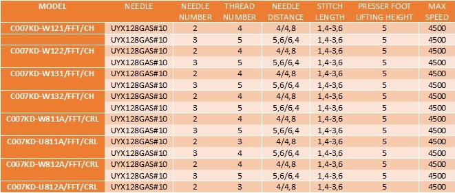 Models with number 121 are for thin materials, 122 for medium thickness materials and 131 for sewing hemming on thin materials and 132 for sewing hemming on medium thickness materials. The 811 models are for coverstitch on thin fabrics and 812 for coverstitch on medium-thickness materials. Both have a left-hand knife.