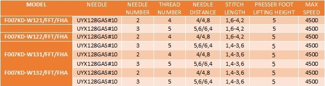 I modelli con numero 121 sono per materiali sottili, 122 per materiali a medio spessore e 131 per orli cuciti su materiali sottili e 132 per orli cuciti su materiali di medio spessore.