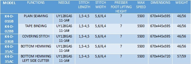 JACK K4-D - si tratta di una macchina di blocco cilindro letto, elettronico con 3 aghi e 5 fili. È in grado di cucire fabbriche sottili o spesse senza rughe.