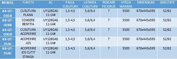 JACK K4-UT – este o masina pentru cusatura de acoperire, computerizata si complet automata, cu brat cilindric, cu 3 ace si 5 fire. Masina se preteaza la cusut atat pe tesaturi groase cat si subtiri, asigurand trecerea acestora prin masina fara deformari.