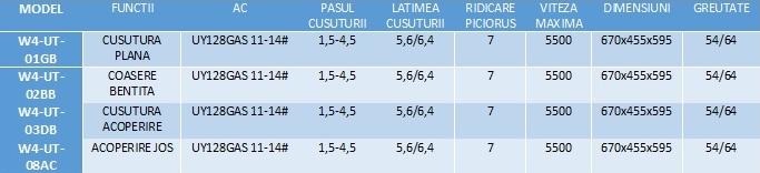 JACK W4-UT – este o masina pentru cusatura de acoperire, computerizata si complet automata, cu 3 ace si 5 fire. Masina se preteaza la cusut atat pe tesaturi groase cat si subtiri, asigurand trecerea acestora prin masina fara deformari.